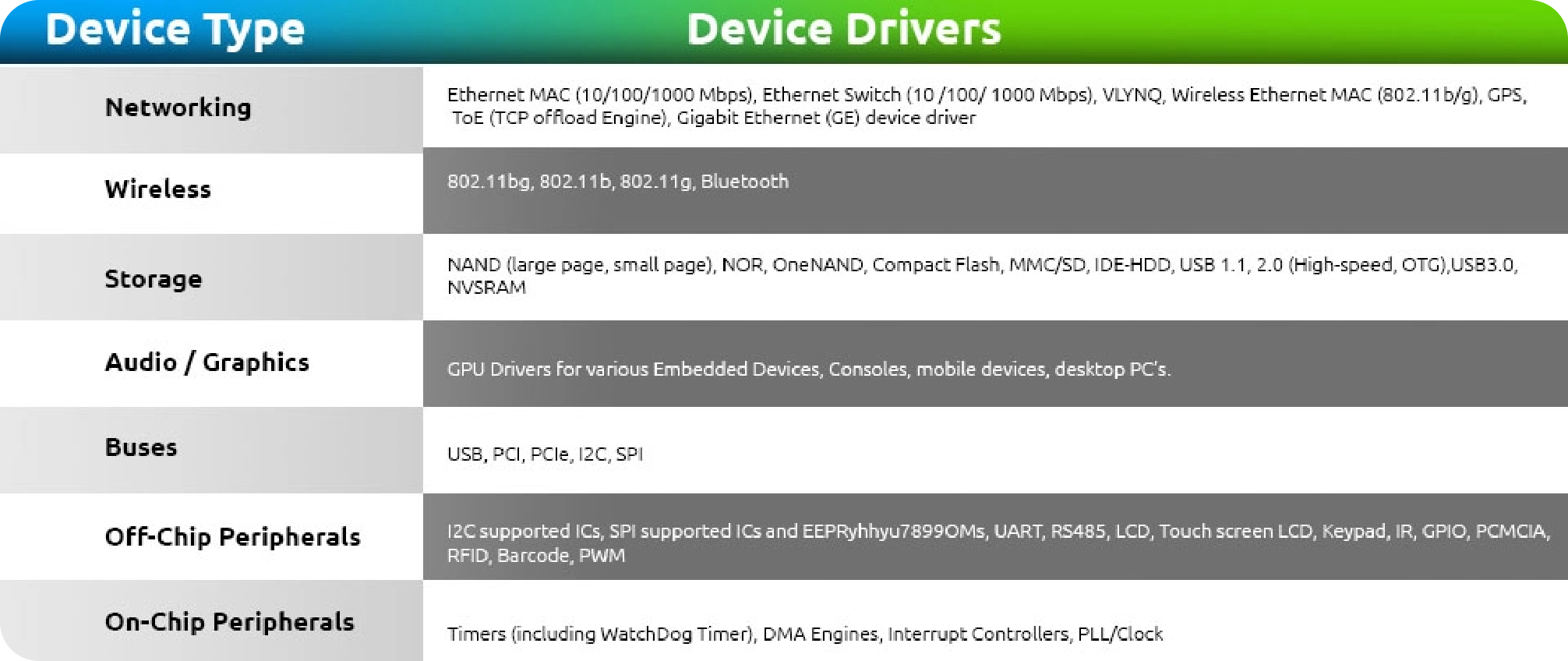 We specialize in creating custom device drivers. Our team provides custom device driver development, modifications to existing device drivers, and porting of existing device drivers to new operating systems or hardware platforms. Our device drivers have supported the following hardware interfaces.